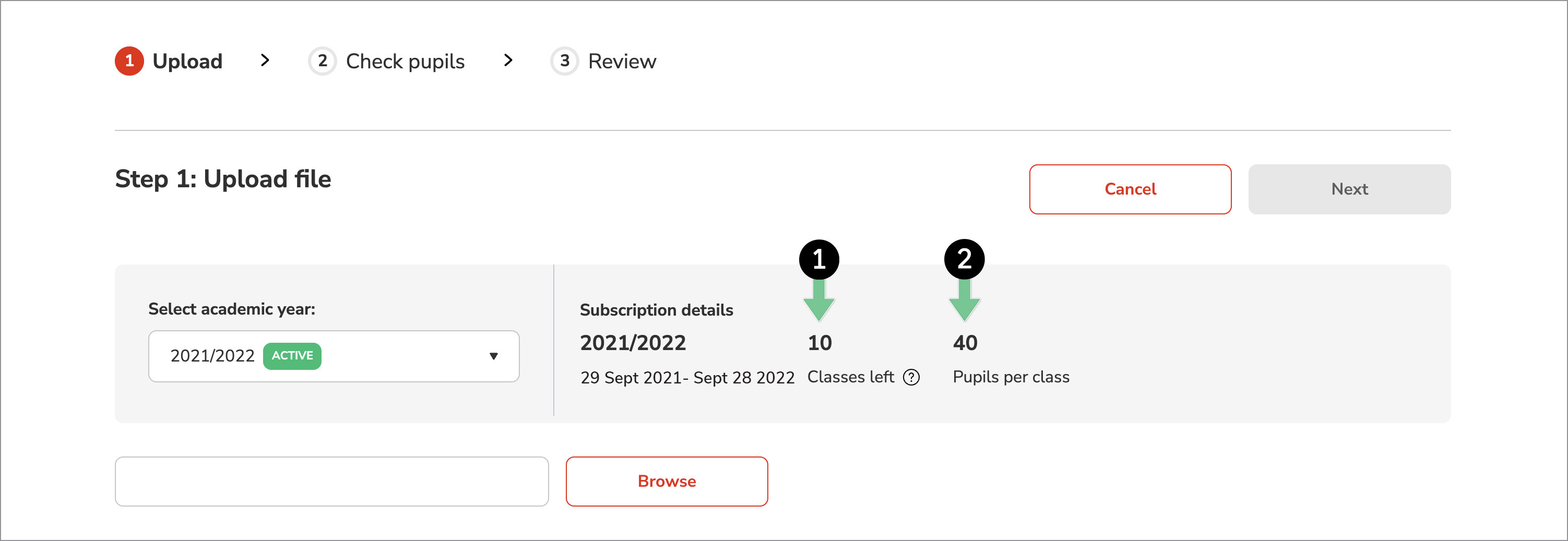 Optional fields Formatting rule Year Group Numbers only Class Letters and/or numbers Additional pupil details: EAL, SEN, PP, FSM Y = Yes N = No Note: If a field is left empty, the system default is N - If classes are included in your file, please check them against the number of classes your subscription allows. To do this, select the appropriate academic year. You’ll see information about your subscription, including how many classes you’re able to upload (1) and how many pupils are allowed per class (2).